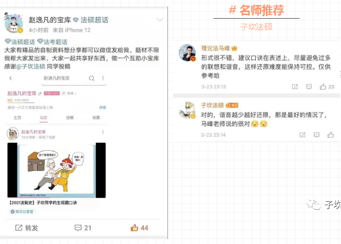 3. 趣味口诀。打破常规记忆方式,给缺乏逻辑的题目编写口诀,朗朗上口,背诵事半功倍。因为坎哥的努力和同学们的认可,利用口诀背诵已经成为法硕考试的主流,综合课尤为重要。坎哥可谓是法硕口诀第一人。口诀比例99%。一个比一个好用。
