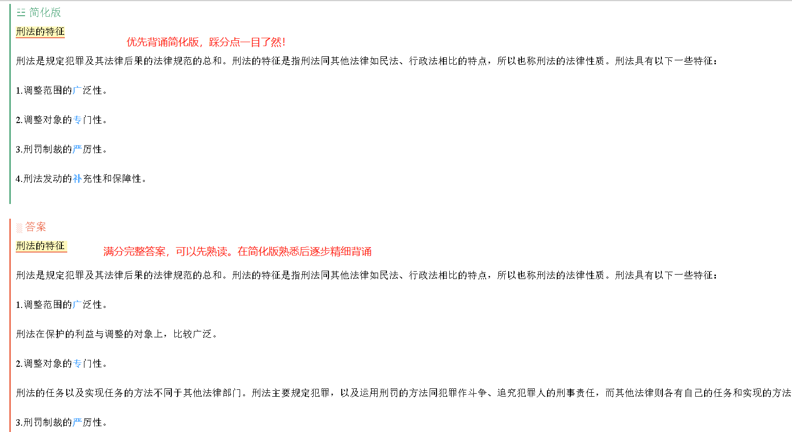 7. 含简化版和完整答案。法硕背诵量巨大,可以先背诵最重要的简化版答案(踩分点),熟读其余部分,后期再逐步精细背诵。既可以提高背诵效率,也可以避免内容太多,后期背不完。此板块为坎哥独创。