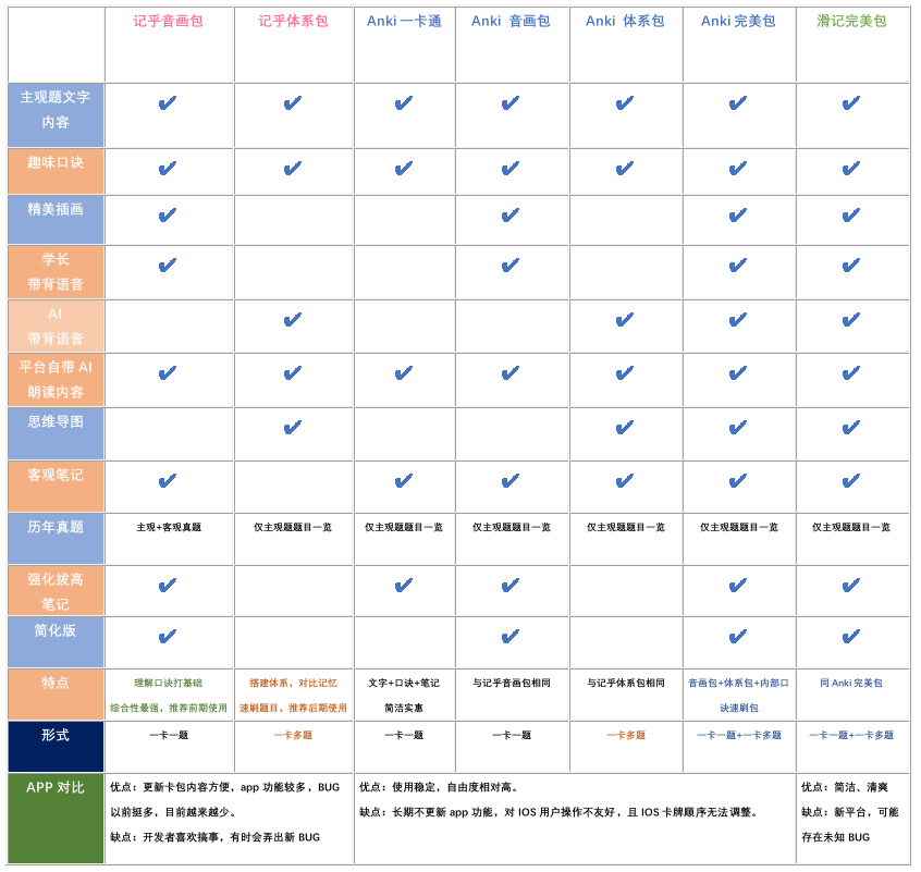 6. 双阶段双模式背诵。本卡包不仅有前期使用的一卡一题(音画包)背诵模式,并且还有后期使用的一卡多题(体系导图包)进行专题式串联记忆,大幅度增加记忆效率,避免了Anki记忆太碎片化的缺点。此板块为坎哥独创。