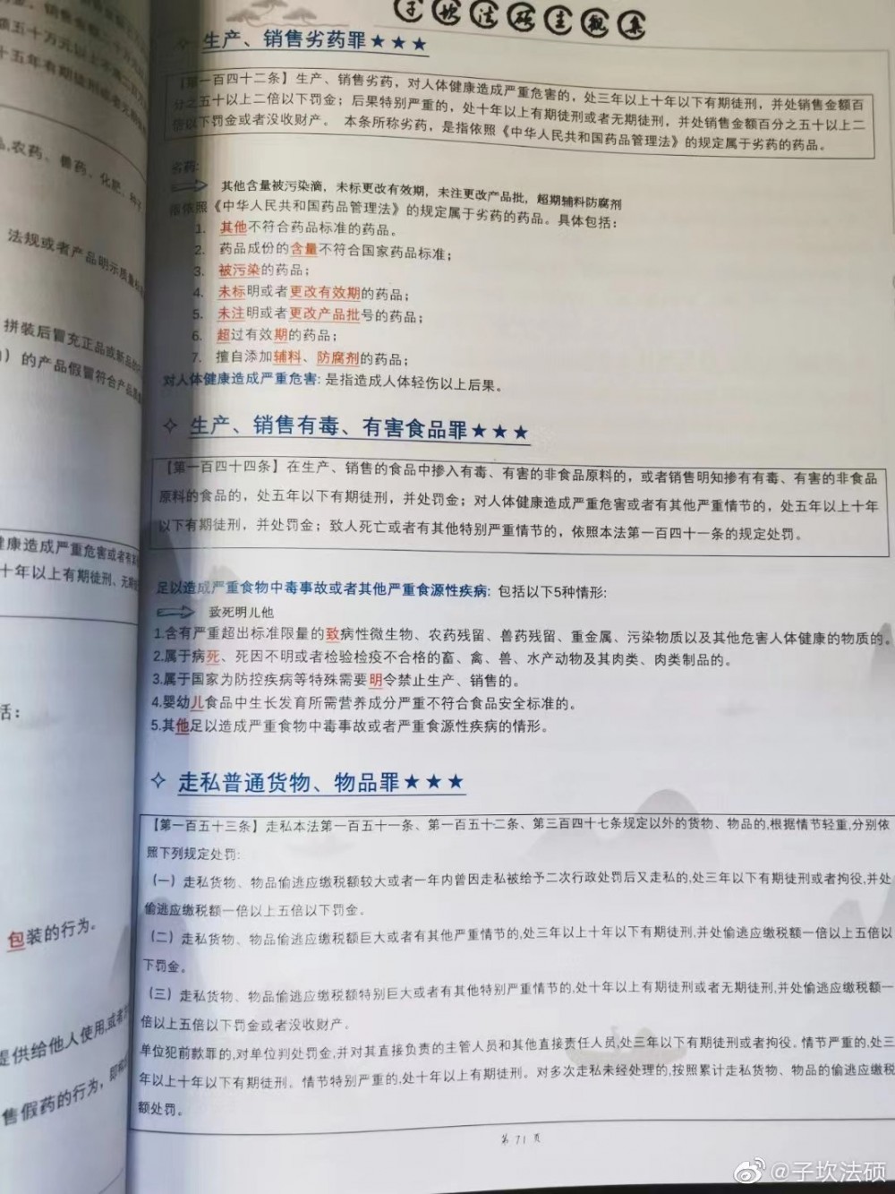 12. 星级、页码标注。星级标注让重点非重点一目了然,能够让目标不同的同学们便于取舍背诵,在重点上多用功,在非重点上节省时间,提高效率。据统计,2021年,坎哥的星级标注有80%的主观题是2星以上。2022年,主观题中70%的真题是3星以上(含论述题、法条分析题),85%的真题是2星以上。此外法条分析题还有司法解释标注(90%的题来源于司法解释),所有题目都有考试分析对应页码标注,方便大家查找。